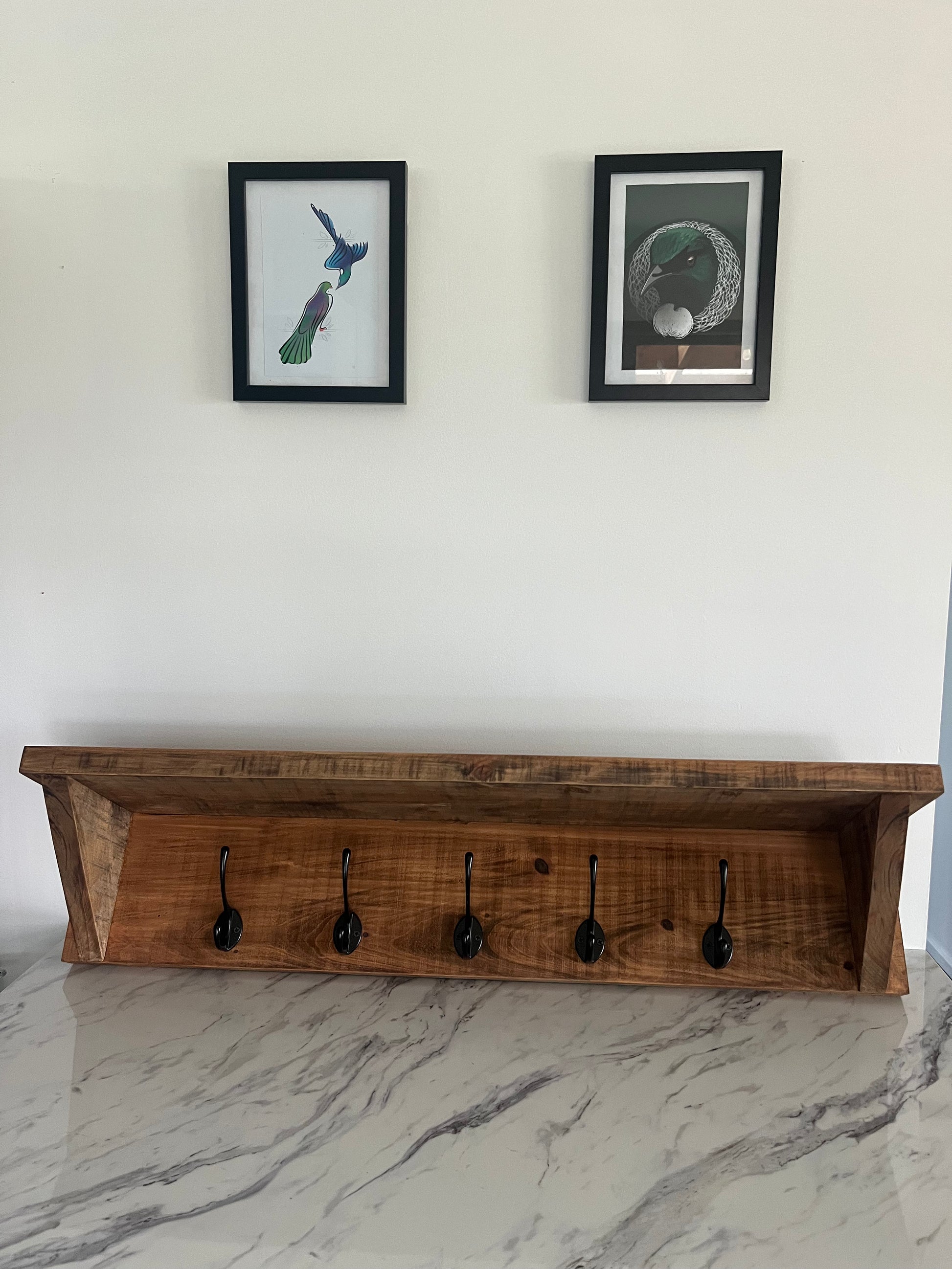 Elevate your entryway with the convenience and charm of the Macrocarpa Coat Rack. Select the size that suits or we can make any size to fit your space. Made from durable macrocarpa wood, this coat rack features a shelf and 3-8 hooks, making it the ideal solution for storing coats, keys, and even your pup's leash. Whether for your entry, mud room, laundry, or garage, this versatile piece adds personality while keeping you organised. Hooks may differ slightly from photos.